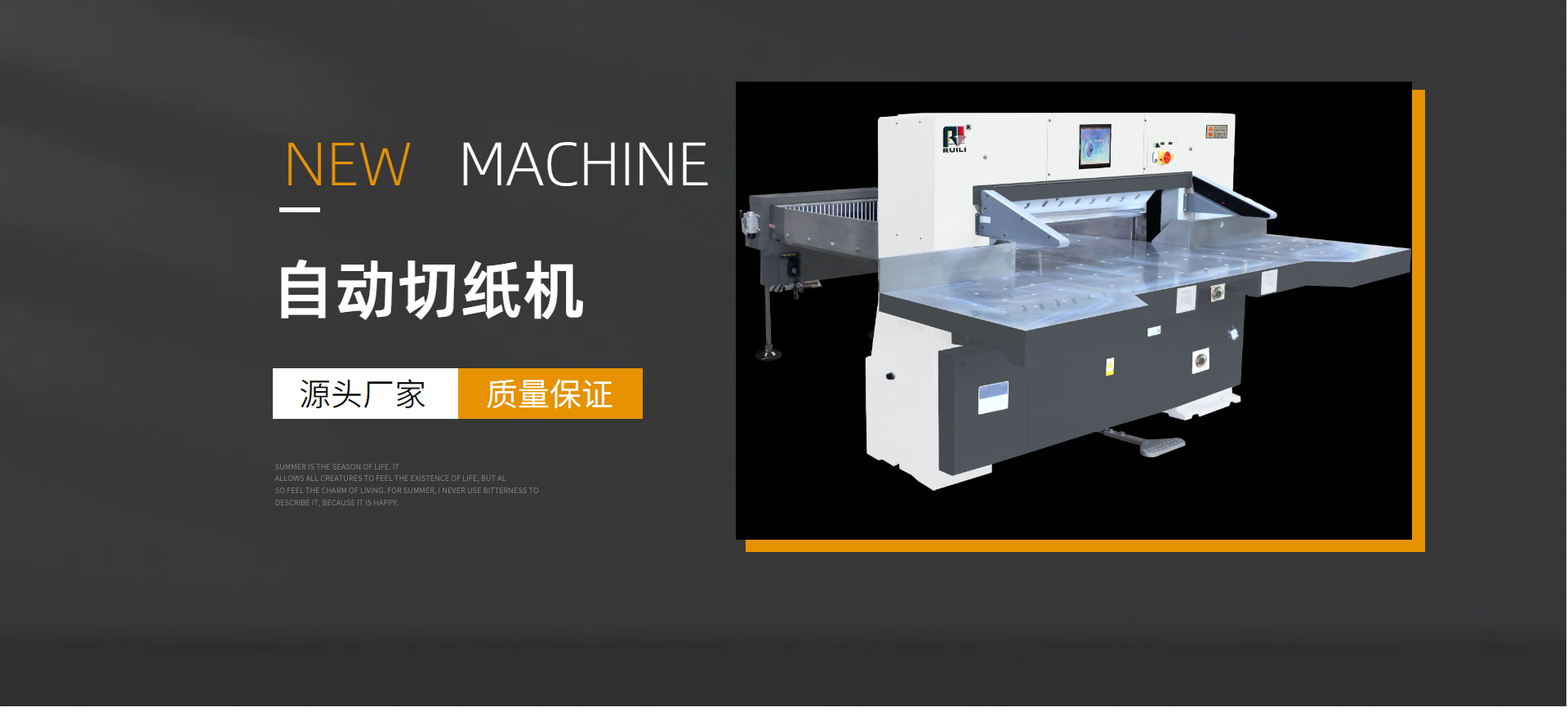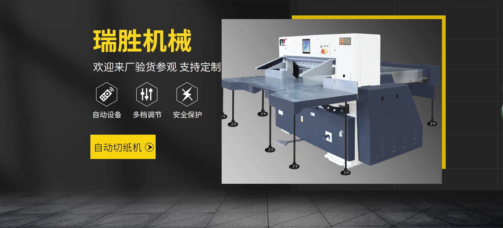 瑞安市瑞勝機械有限公司是一家專業(yè)集“生產、銷售、服務”于一體的印刷包裝機械企業(yè);有二十余年專業(yè)制造切紙機的經驗,在切紙機行業(yè)中享有較高聲譽。研制出集光、機電、液為一體的高性能高品質的切紙機系列產品,主要產品有電腦切紙機,雙液壓電腦切紙機,雙導軌數顯切紙機,快捷式壓痕機系列,覆膜機、上光機、燙金機等系列產品。